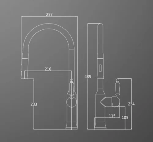 ברז מטבח נשלף בעל 2 מצבי זרימה וידית חרס לבנה.