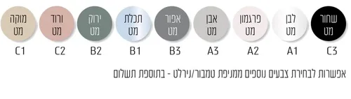 צבעים לבחירה: שחור מט, לבן מט, פרגמון מט, אבן מט, אפור מט, תכלת מט, ירוק מט, ורוד מט, מוקה מט.