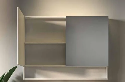 ארונית מראה עם שתי דלתות זכוכית ומדף פתוח.