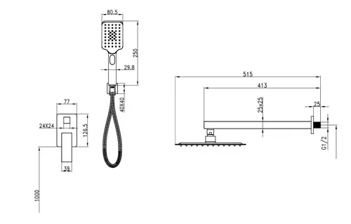 ראש מקלחת 25 ס"מ מנירוסטה 304, זרוע מרובעת מהקיר – 40 ס"מ,
