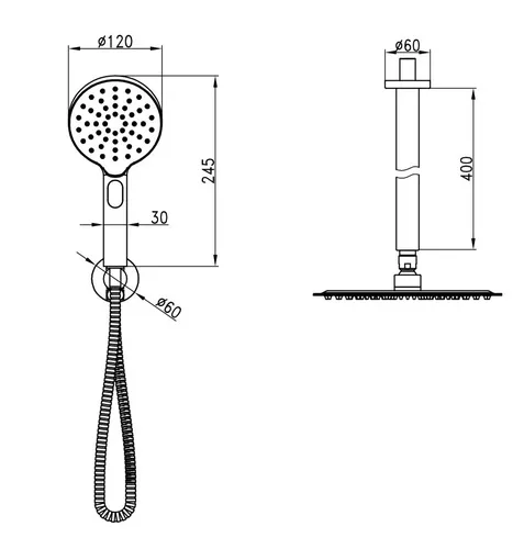 ראש מקלחת עגול 25 ס"מ מנירוסטה 304, זרועה עגולה מהתקרה 20 ס"מ/ 40 ס"מ (ניתן לבחירה)