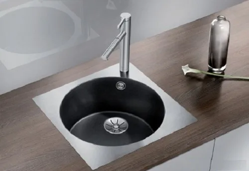 כיור מטבח בלנקו מקורי מדגם ארטגו. כיור פנימי עגול סיליגרניט עם פנל חיצוני מרובע מנירוסטה.
