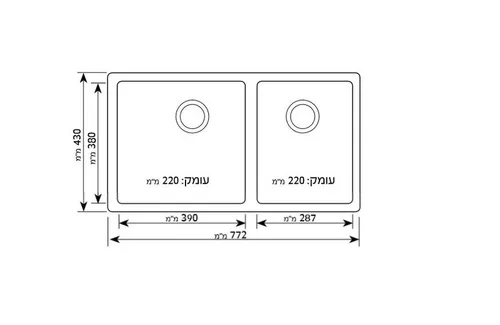 אורך: 43 ס"מ, רוחב: 77.2 ס"מ, עומק הכיור 22 ס"מ.