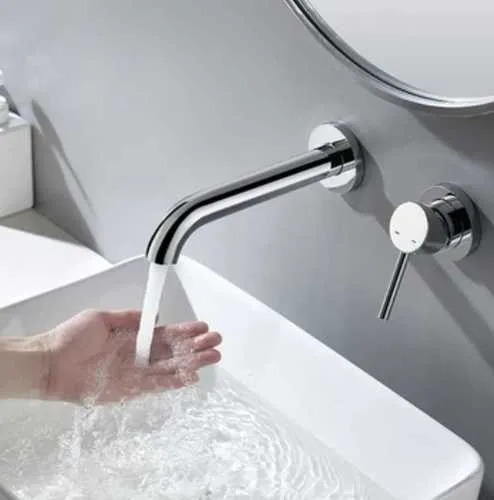 ברז מהקיר עם ידית יד בעיצוב מנימליסטי.