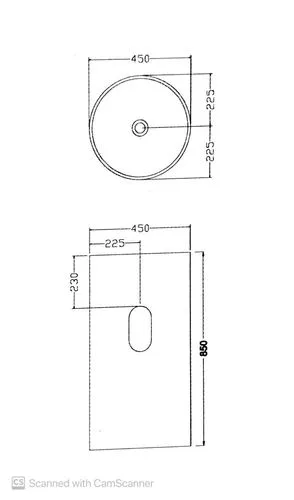 גובה הכיור: 850 מ”מ. קוטר: 450 מ”מ. עומק הכיור: 230 מ"מ.