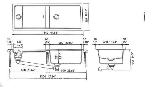אורך: 46 ס”מ, רוחב: 114 ס"מ, עומק הכיור הקטן: 14 ס"מ עומק הכיור הגדול: 23 ס"מ.