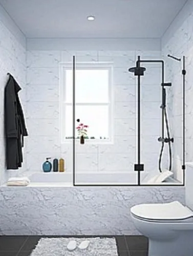אמבטיון בפרזול מינימלי בקו נקי, דופן קבועה + דלת הנפתחת פנימה והחוצה.