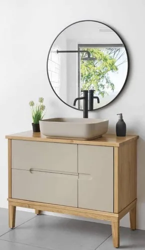 ארון צבוע אפוקסי, בסיס רגלי הארון מעץ, גוף סנדוויץ, חזית MDF ירוק לחדרים רטובים.