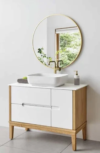 ארון צבוע אפוקסי, בסיס רגלי הארון מעץ, גוף סנדוויץ, חזית MDF ירוק לחדרים רטובים.