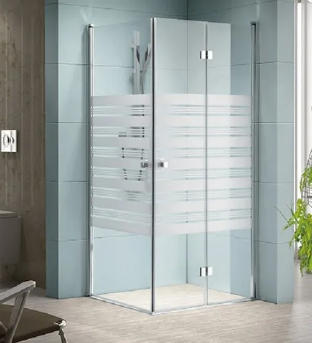 מקלחון פינתי דגם סלוניקי. דלת הרמוניקה מתקפלת ונצמדת לקיר ודלת על ציר נפתחת פנימה והחוצה.