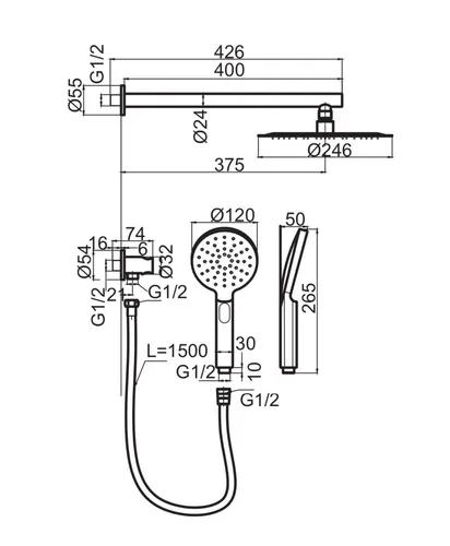 ראש מקלחת עגול 25 ס"מ, זרוע לראש מקלחת, מזלף בעל 3 מצבים,