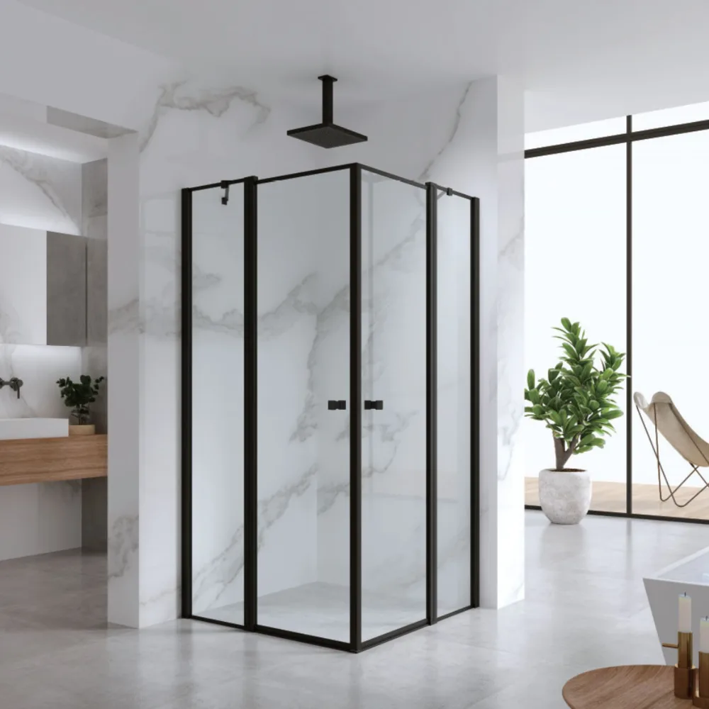 מקלחון פינתי מדגם סולרו 50, בעל 2 דלתות על ציר הנפתחות פנימה והחוצה + 2 דפנות קבועות.