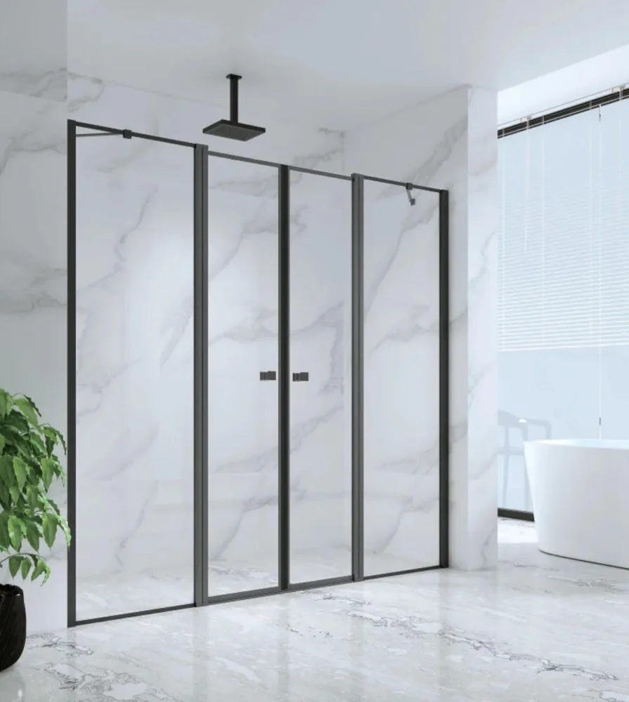 מקלחון חזית מדגם רוקסי 60, בעל 2 דלתות על ציר הנפתחות פנימה והחוצה + 2 דפנות קבועות.