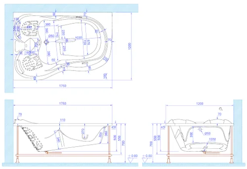 תכולת מים: 180 ליטר. משקל: 50 ק"ג. האמבטיה כוללת אנטיסליפ נגד החלקה וחיזוק פלדה היקפי.