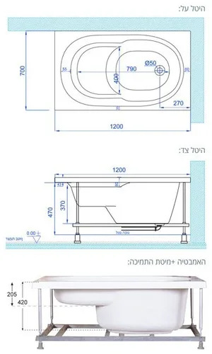 תכולת מים: 75 ליטר. משקל: 19 ק"ג. האמבטיה כוללת אנטיסליפ נגד החלקה וחיזוק פלדה היקפי.