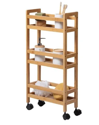 עגלת שירות מבמבוק בעלת 3 קומות על גלגלים.