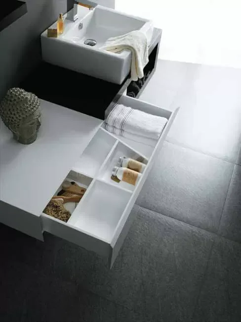 מגירה טריקה שקטה + משטח פורניר בשילוב אפוקסי + מראה קריסטל בלגי מרחפת
